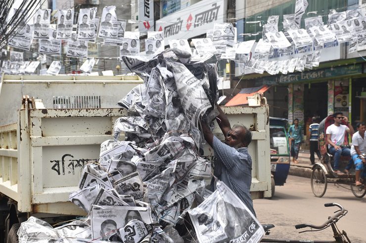 ঢাকার দুই সিটি করপোরেশন নির্বাচনে প্রচারণার জন্য প্রথম বারো দিনে প্রায় ২৫০০ টন প্লাস্টিক বর্জ্য উৎপন্ন হয়েছে। প্রতিযোগী প্রার্থীরা তাদের পোস্টার, লিফলেট এবং কর্মীদের পরিচয়পত্রের জন্য এসব প্লাস্টিক ব্যবহার করেছেন।
