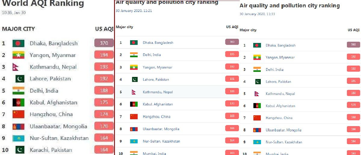 তবে, বেলা বাড়ার সাথে সাথে বায়ু দূষণের মাত্রা কিছুটা কমতে দেখা গেছে। এতে ঢাকার অবস্থান শীর্ষে থাকলেও পরবর্তী স্থানগুলোতে পরিবর্তন লক্ষ্য করা গেছে।