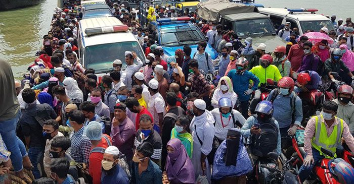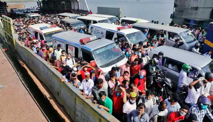 ঈদ শেষ, বাড়ছে না ছুটি। খুলছে কলকারখানা, অফিস আদালত। তাই ঢাকায় ফিরতে শিমুলিয়া ফেরিঘাটে জনস্রোত। করোনা সংক্রমণের ঝুঁকি নিয়েই ফিরছে নগরবাসী। শিমুলিয়া-কাঁঠালবাড়ি রুট দিয়ে ঢাকা ফেরেন দক্ষিণের ২১ জেলার মানুষ। এখানে ১৭টি ফেরির মধ্যে ১০ দিয়ে চলছে পারাপার। একই অবস্থা পাটুরিয়া-দৌলতদিয়া ঘাটে। বৃহস্পতিবার দিনের শুরুতে চাপ না থাকলেও দুপুরে দক্ষিণ-পশ্চিমাঞ্চলের মানুষের ঢল নামে এখানে। বিআইডব্লিউটিসি জানিয়ে, গত ২৪ ঘণ্টায় এ রুটে পারাপার হয়েছে আড়াই হাজারের বেশি যানবাহন।