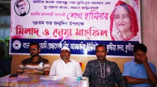 শাহীন রেজা, কুষ্টিয়া জেলা প্রতিনিধি।। জাতির জনক বঙ্গবন্ধু কন্যা জননেত্রী শেখ হাসিনার ৭৪’তম জন্মদিন উপলক্ষে কুষ্টিয়ায় মনোহরদিয়া ইউনিয়ন সেচ্ছাসেবক লীগের আয়োজনে জন্মদিনে মিলাদ মাহফিল, দোয়া ও আলোচনা সভা অনুষ্ঠিত হয়েছে।