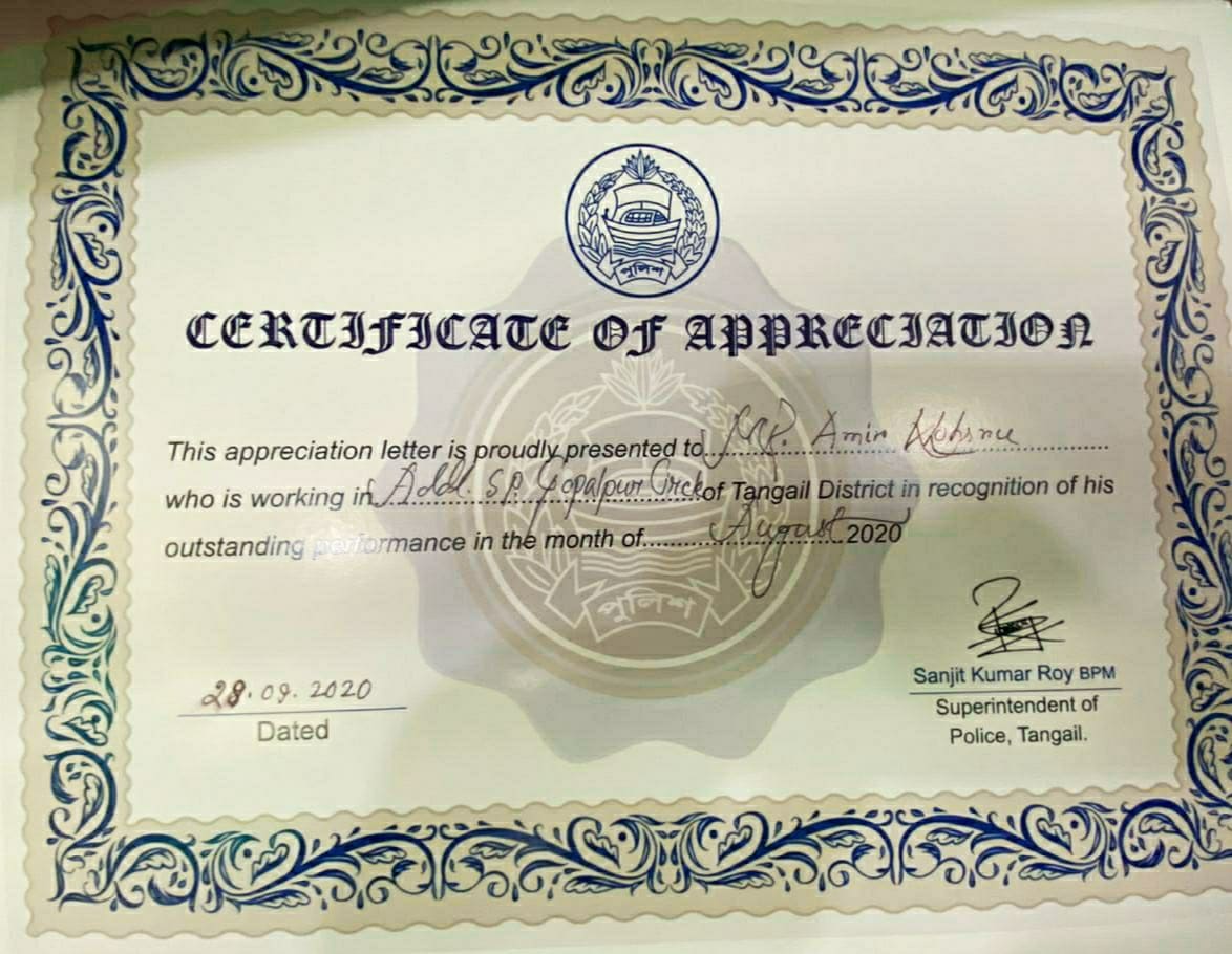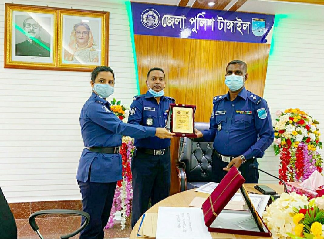 জেলা পুলিশ সুপারের কার্যালয়ের কনফারেন্স রুমে সোমবার (২৮ সেপ্টেম্বর) মাসিক অপরাধ সভায় পুলিশ সুপার সঞ্জিত কুমার রায় বিপিএম, আগস্ট ২০২০ মাসে ভালো কাজের স্বীকৃতি স্বরূপ অতিরিক্ত পুলিশ সুপার (গোপালপুর সার্কেল) মো. আমীর খসরুকে টাঙ্গাইল জেলার শ্রেষ্ঠ সার্কেল অফিসার হিসেবে নির্বাচিত করে, সম্মাননা স্মারক ও সনদপত্র প্রদান করেন।